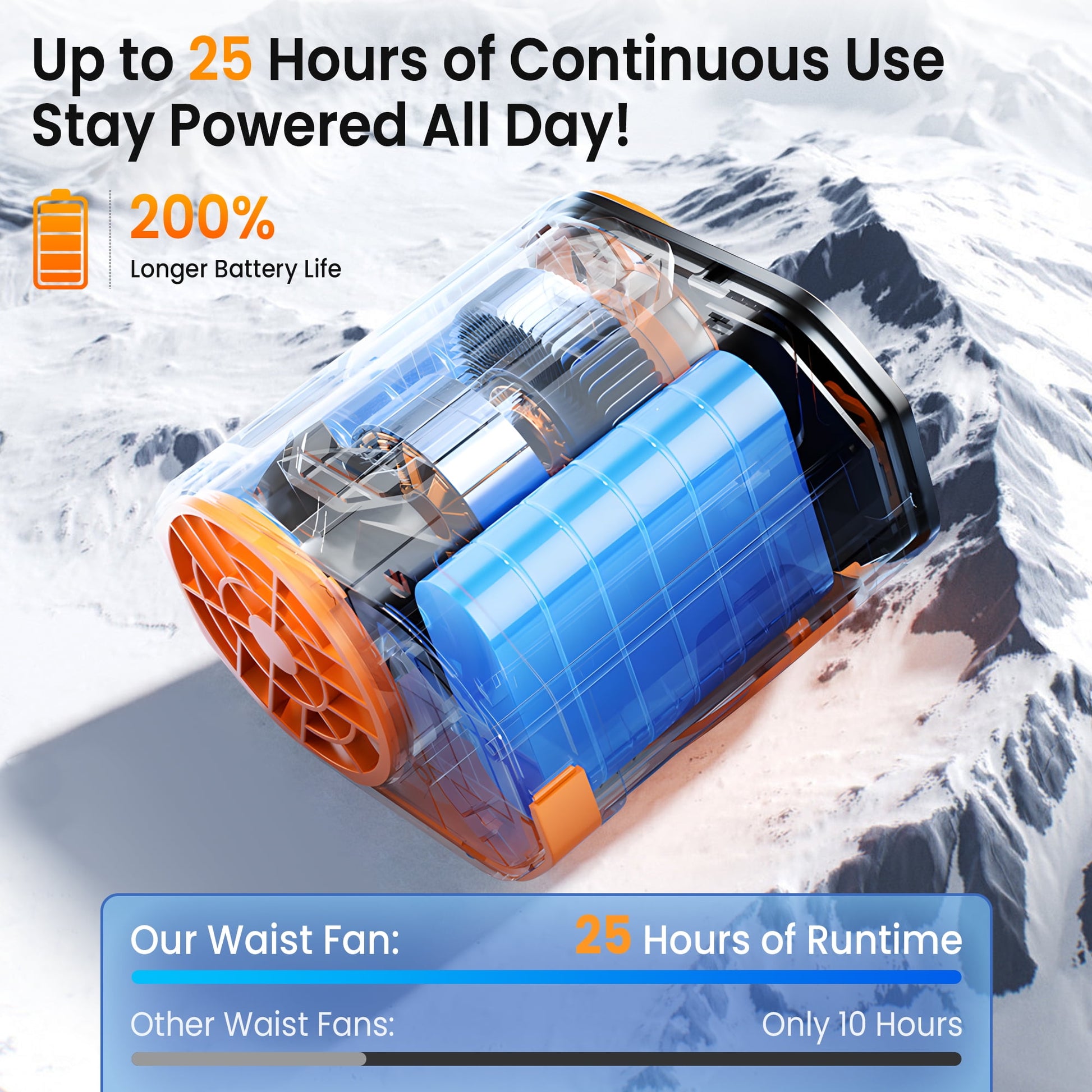 - Long-Lasting Battery Life & Stay Cool for Up to 25 Hours: Powered by a 4000mAh rechargeable battery, this waist fan provides up to 25 hours of continuous cooling on the lowest wind speed setting, making it perfect for a full day of outdoor activities or work. Stay cool and refreshed from dawn to dusk, even in the hottest summer.