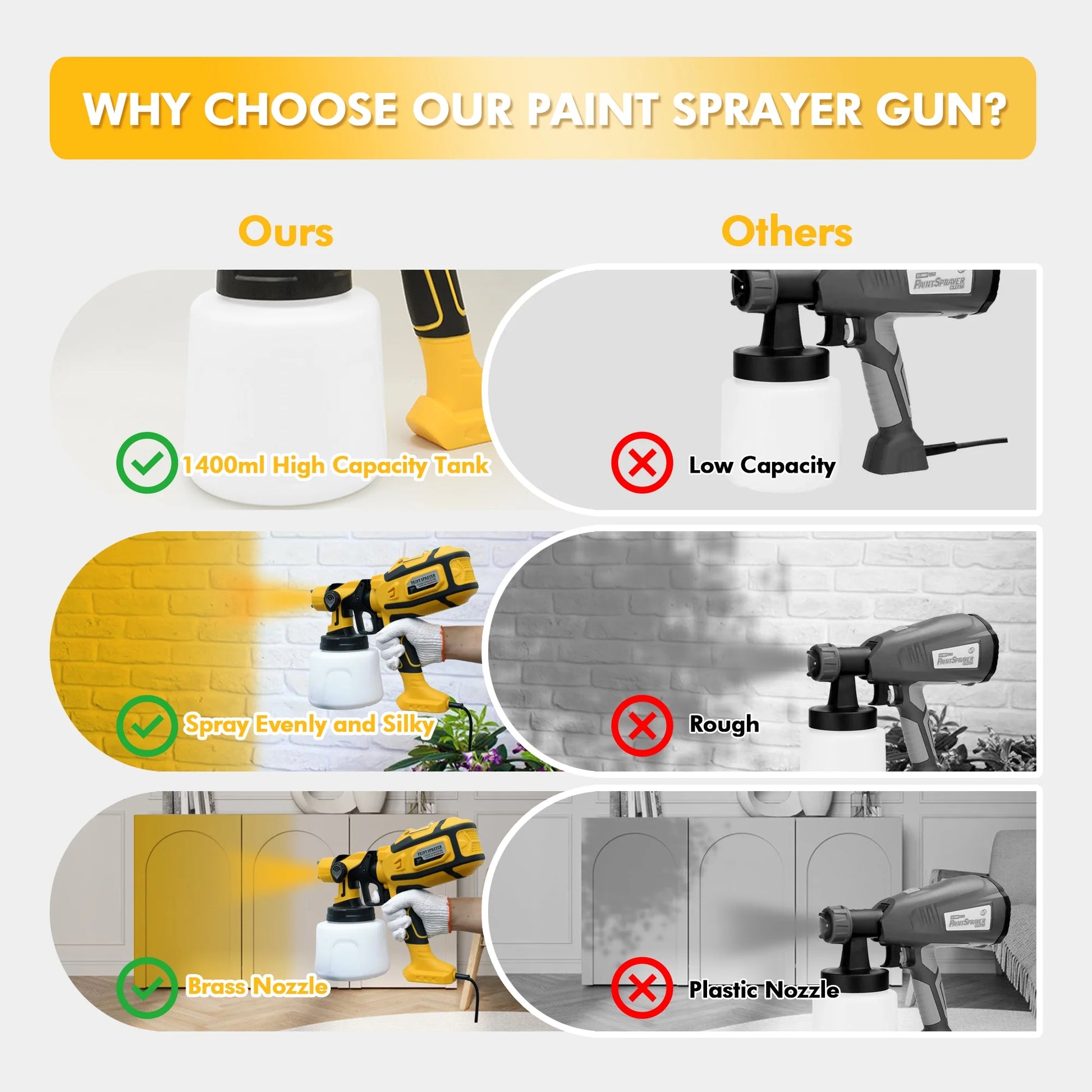 Fixdono Paint Sprayer 800W HVLP High Power Electric Spray Paint Gun with 1400ml Container, 5 Copper Nozzles & 3 Patterns, Spray Gun for Furniture, Walls, House Painting