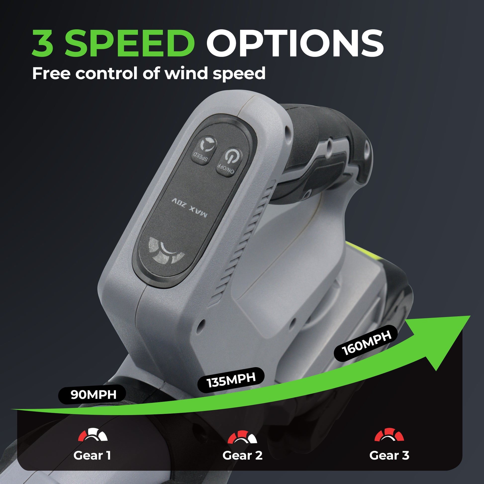 Unleash the power of a 17,000 RPM motor with twin-turbo engineering, stably delivering an impressive 190 CFM air volume and 160 MPH airspeed to improve your work efficiency. Whether you're clearing leaves, debris, sidewalks, or doing lawn care, the three adjustable speed modes (ranging from 90 MPH to 160 MPH airspeed) allow you to tackle a variety of tasks with ease.