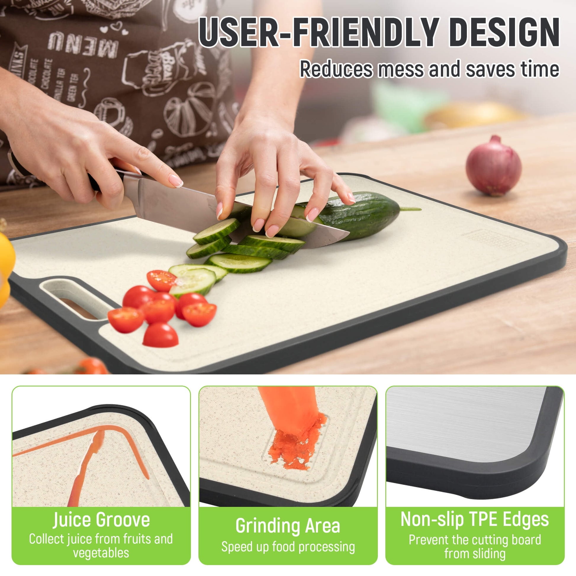 Keep your kitchen tidy with our wheat straw PP cutting boards non toxic. The built-in juice groove catches liquids to prevent spills, while the integrated garlic grinding zone lets you prep garlic or ginger right on the board—no extra tools needed. Saving you time and cleanup.
