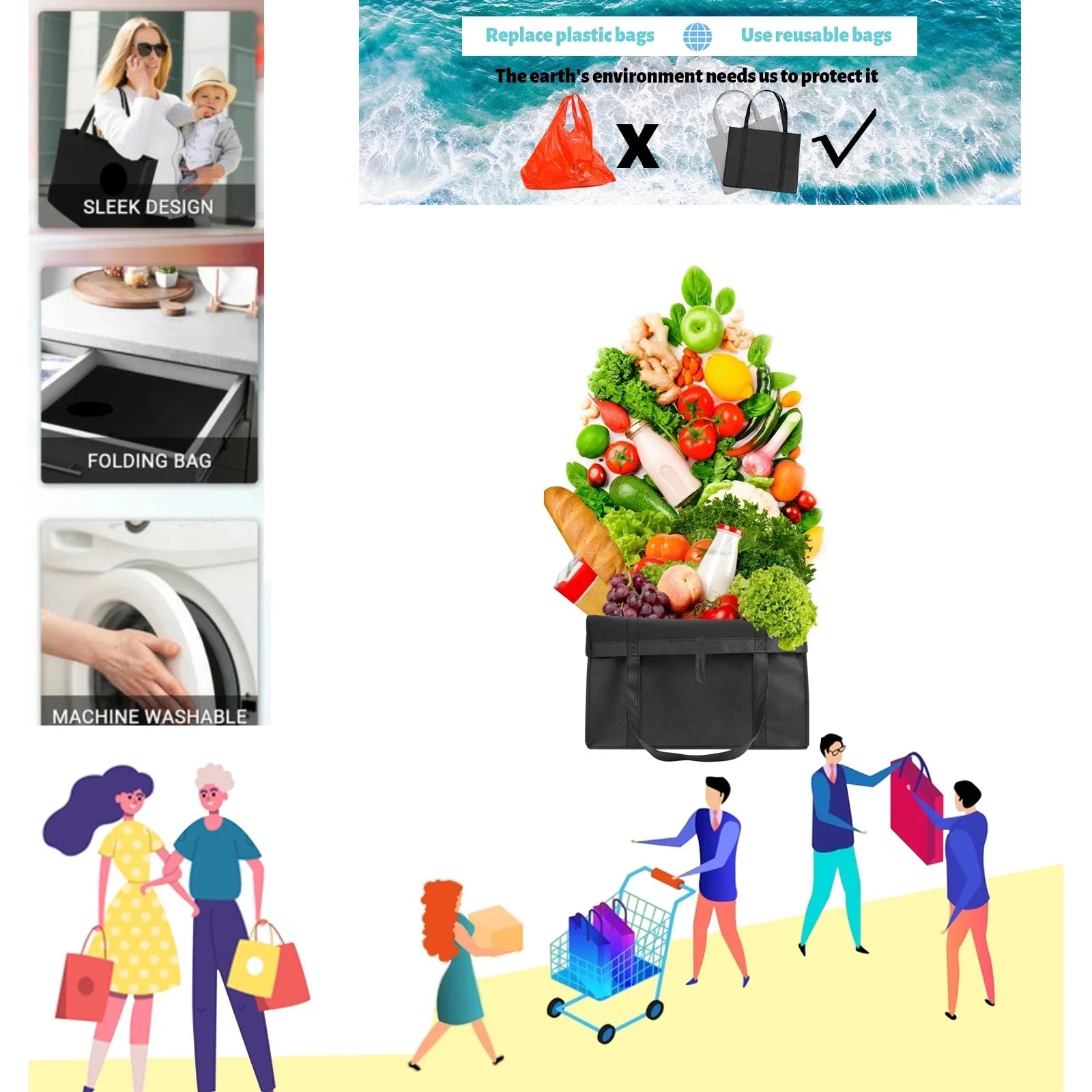 Sentryse Set of 3 Reusable Grocery Bags,Large Foldable Heavy Duty Bag, Shopping Tote Produce Bag with Reinforced Handles & Thick Plastic Support Bottom, Black Washable Storage