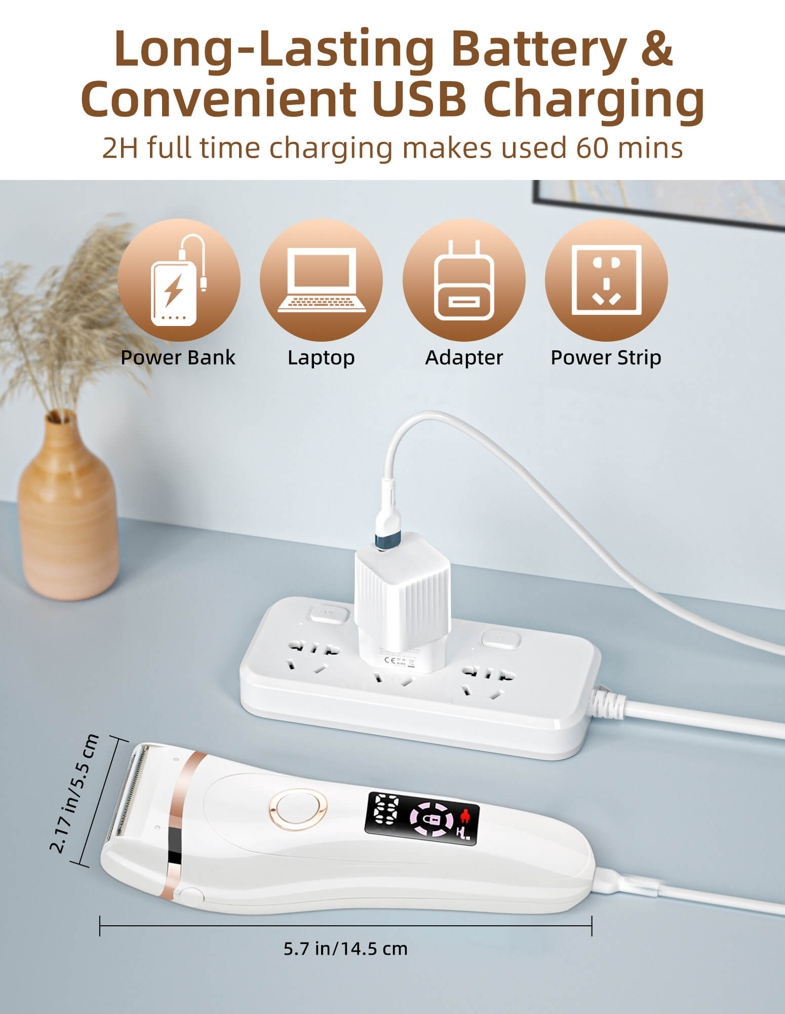 1.5H Quick Charge, 90 Minutes Shaving:The ladies electric shaver with Built-in rechargeable Lithium battery, the battery has a long life and does not require frequent recharging. Full charged in 1.5 Hours, lasts for 90 minutes shaving. USB charging make it available to charge by pc, power bank or direct power connection, and it's very light and small, very convenient for you to carry for travel anywhere. (just include cable, no include charger)